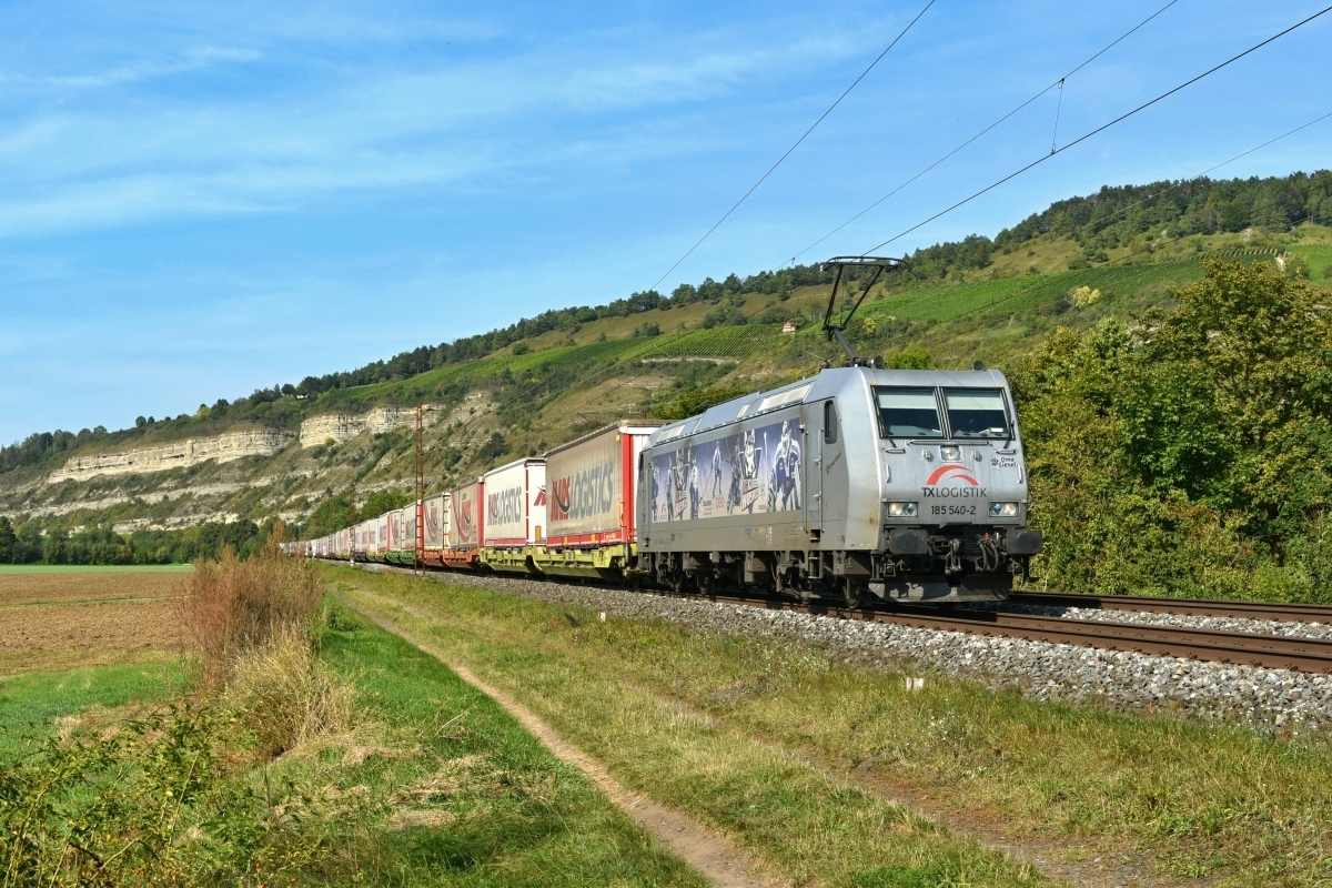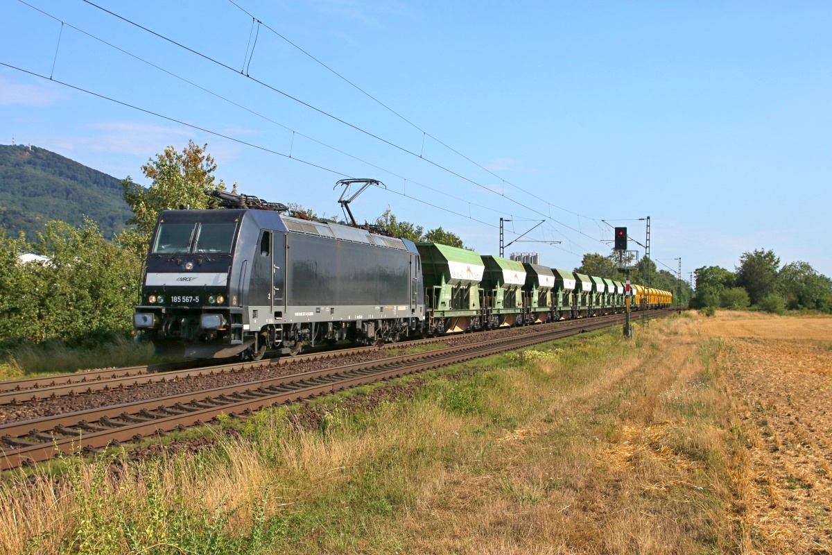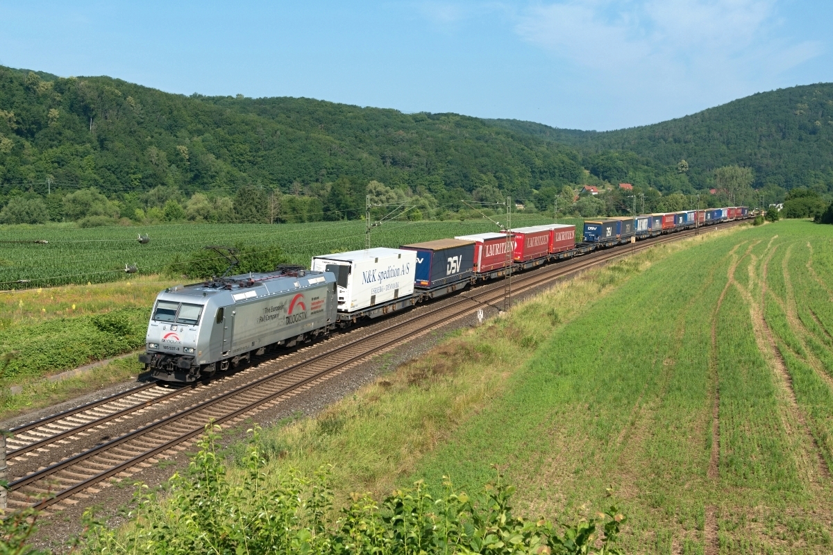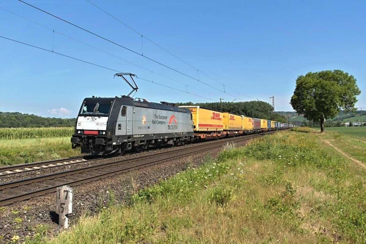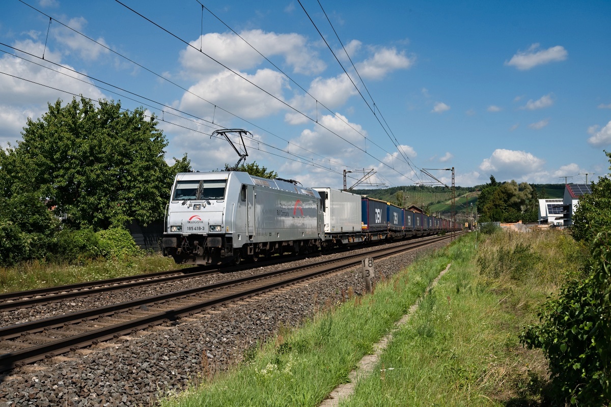 Dto. 185 418-3 am 10.08.2023 bei Himmelstadt (NHIS) mit einem KLV Rtg.