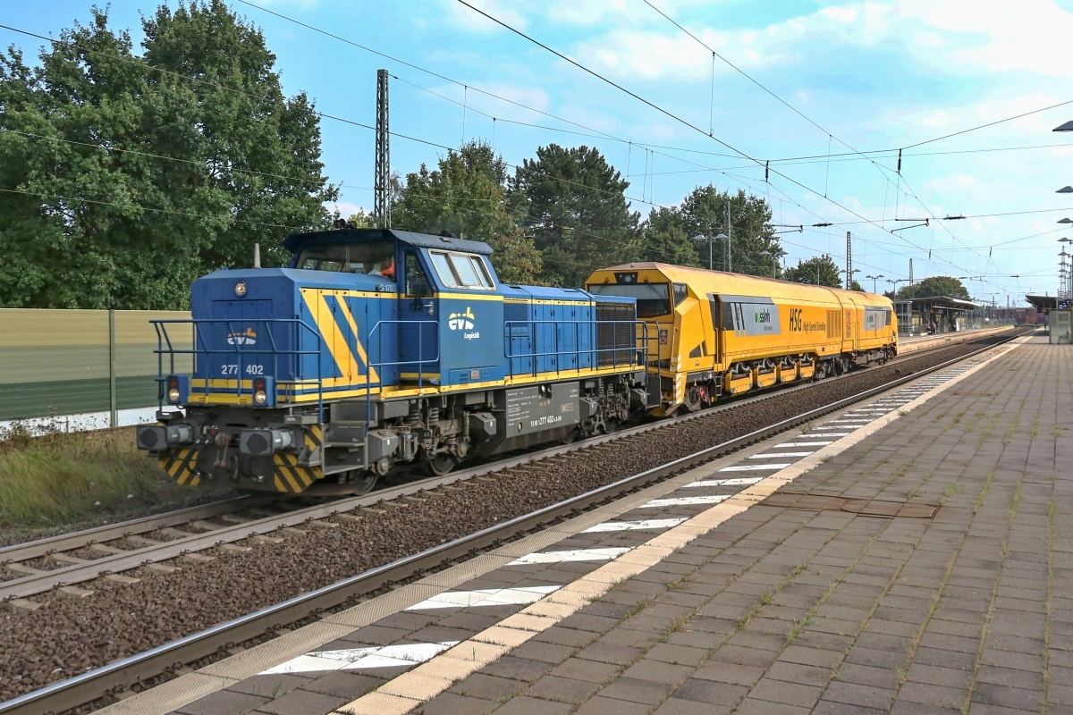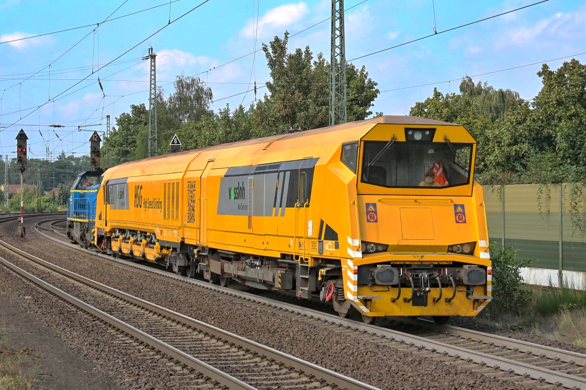 Vossloh Schienenschleifzug (NVR: 99 80 9527 003-4 D-VMRS) High Speed Grinding - Schleifzug HSG-2 mit 80 km/h... Dieser Zug passierte (gezogen von EVB 277 402-4) hier am 10.09.2016 Nienburg Rtg. Norden...