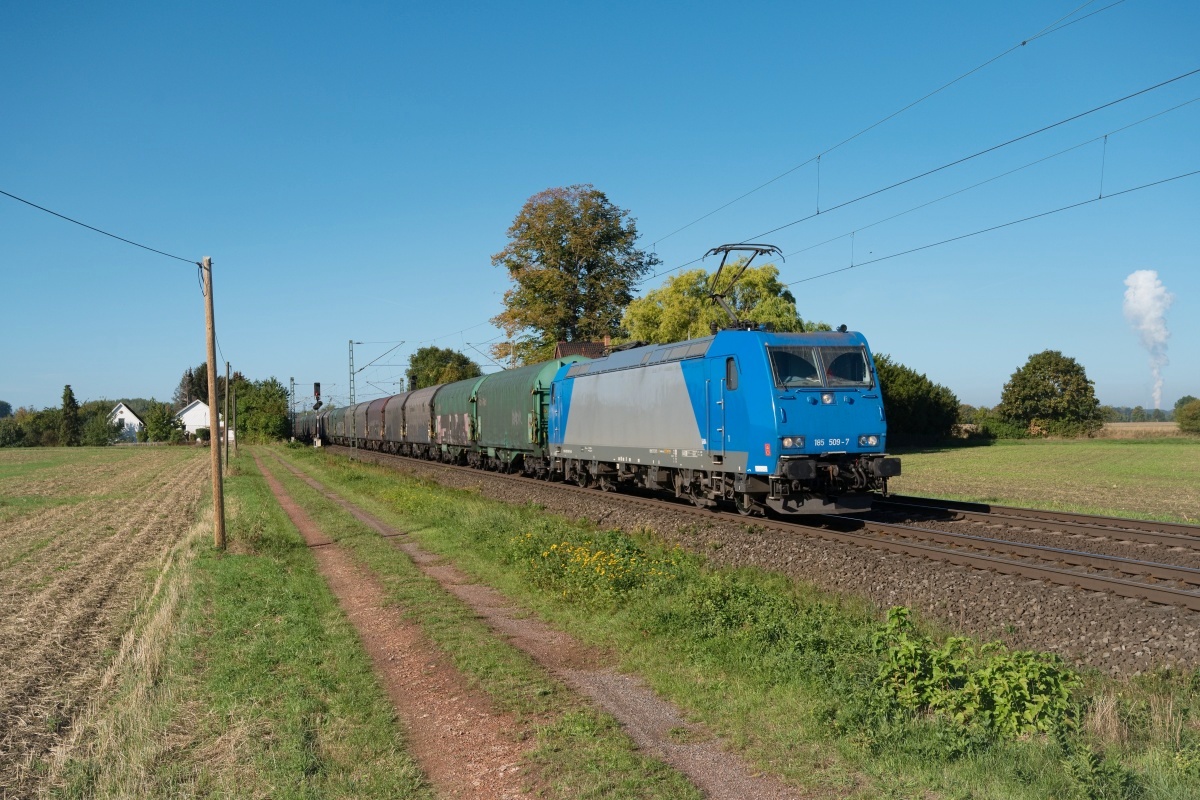 war hier am 09.10.2021 bei Wierthe (HWIR) mit einem Stahlzug Rtg.