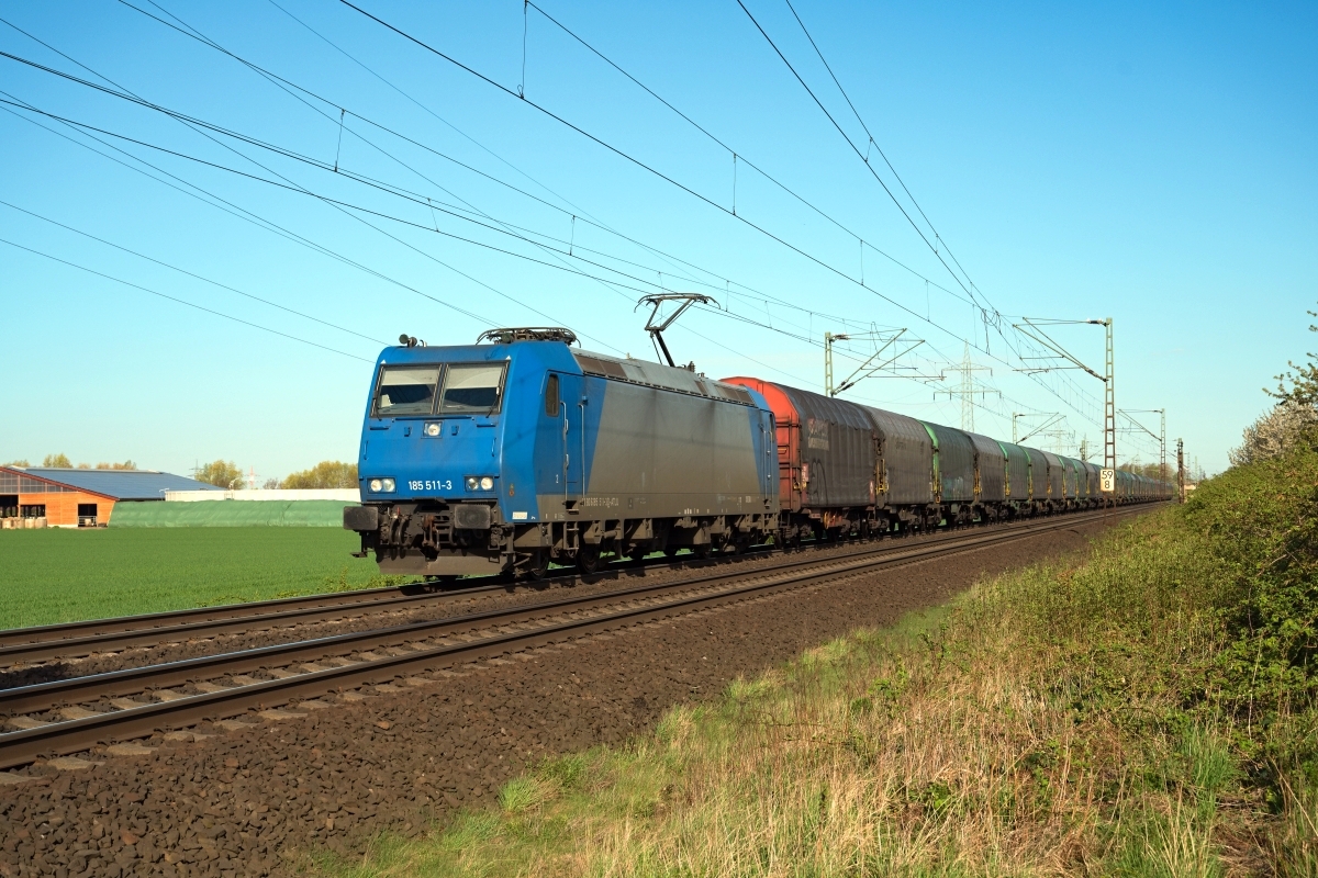Dto. 185 511-3 am 27.04.2023 bei Otze (HOTZ) mit aktuell neuer Werbefolie und 185