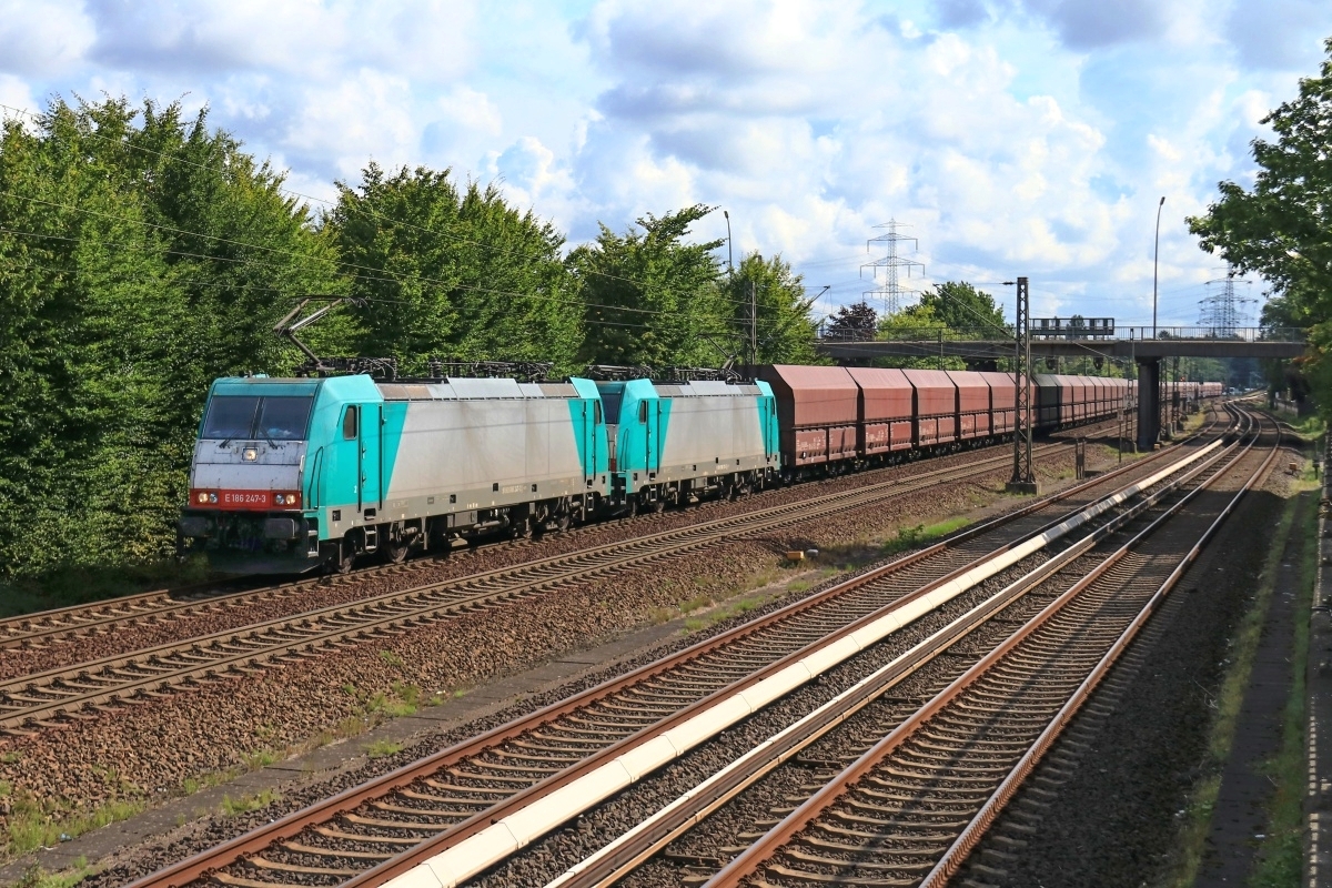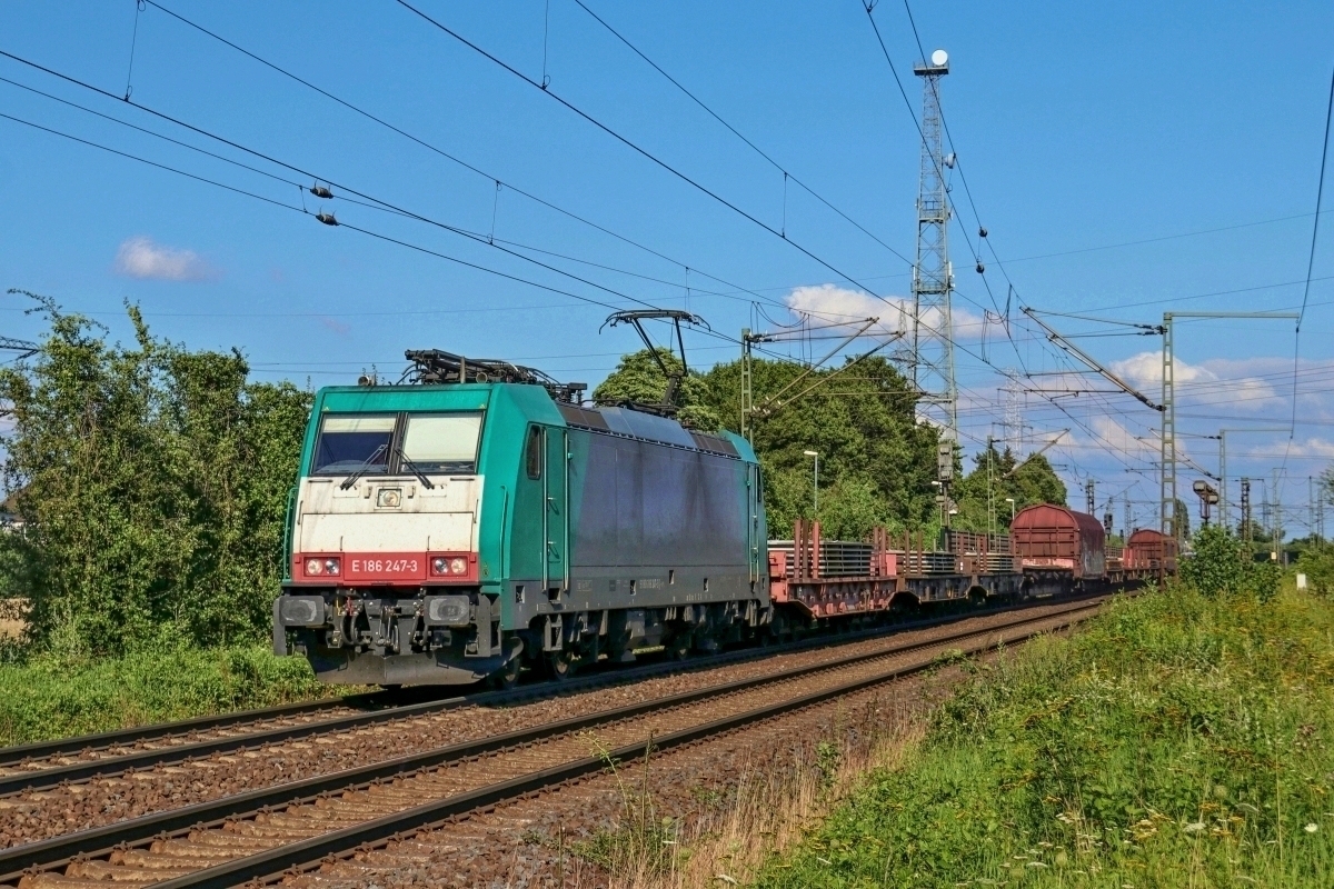 186 247-3 passierte hier am 03.08.2017 Ahlten mit einem Stahltransportzug