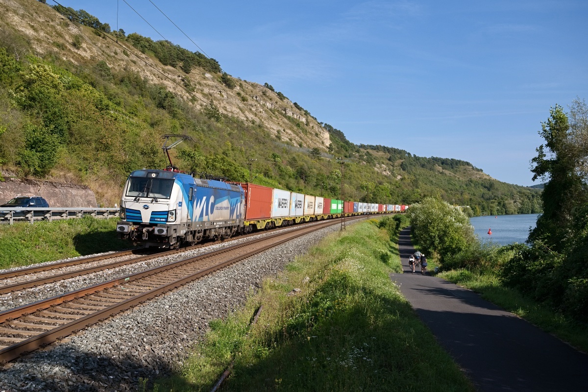 bei Harrbach im Maintal mit einem Containerzug Rtg. Süden/Würzburg (NWH)...