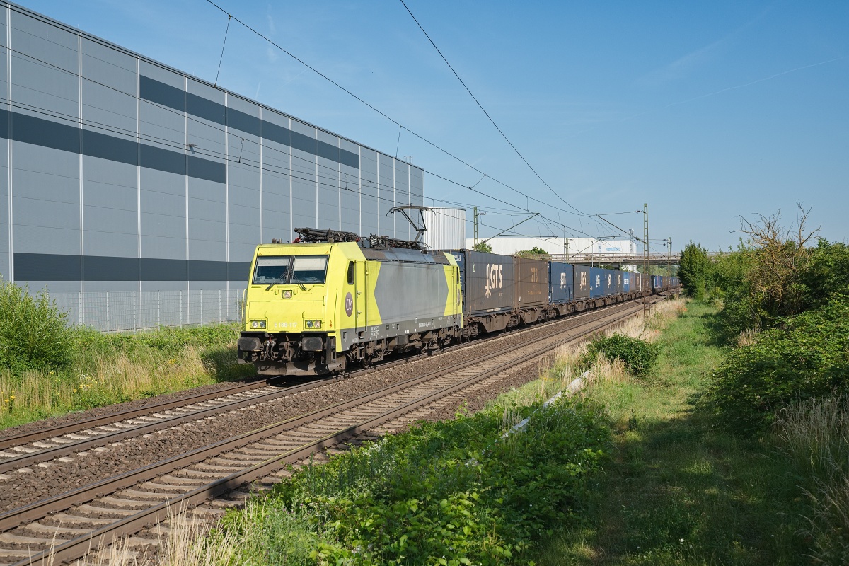 Dto. 186 117-5 am 22.06.2025 bei Groß-Gerau (FGER) mit einem KLV Rtg. Osten/Weiterstadt (FWI)...