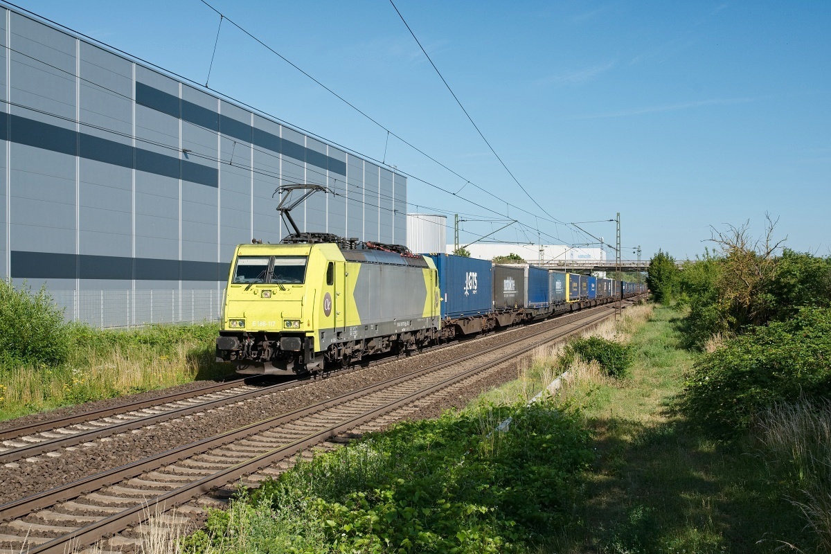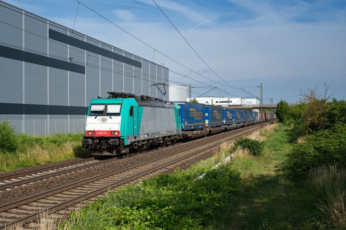 Dto. 186 150-9am 21.06.2022 bei Altheim (FAT) mit einem Containerzug Rtg.