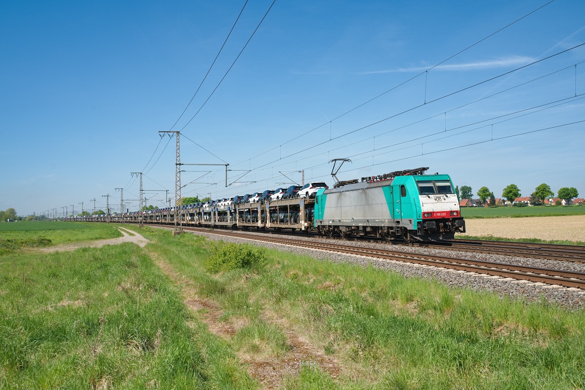 Dto. 186 213-5 am 10.05.2025 bei Gohfeld (HGOF) mit einem Voll-BLG Autozug