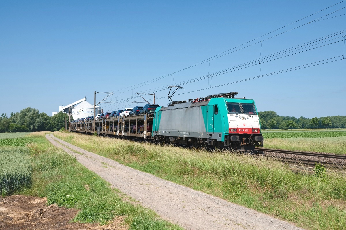 Dto. 186 230-9 am 12.06.2025 bei Wierthe (HWIR) mit einem Voll-BLG Autozug