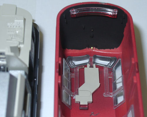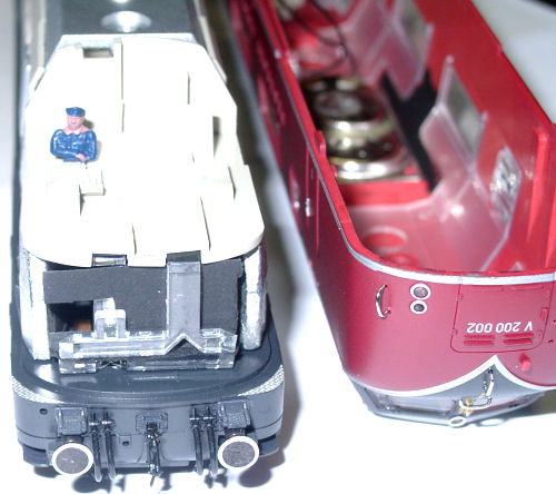 Hier einige Bilder der Roco 69931 Sound V 200 von innen 14.07.08 Habe die Lok gleich nach dem Kauf geöffnet, da das Licht der Frontbeleuchtung durch das Gehäuse scheint und verbessert.